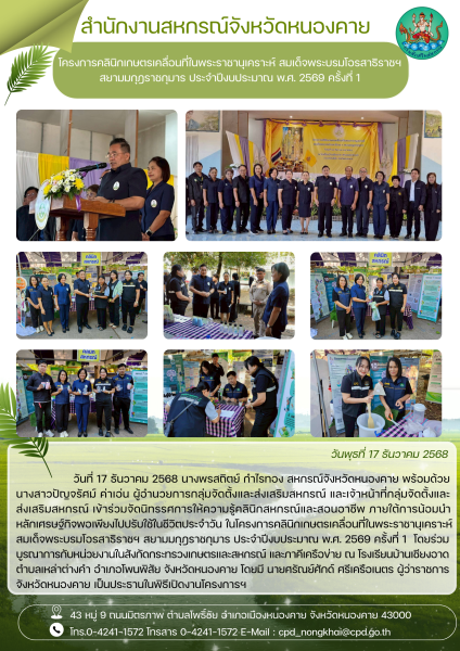 วันที่ 17 ธันวาคม 2568 นางพรสถิตย์ กำไรทอง สหกรณ์จังหวัดหนองคาย พร้อมด้วย นางสาวปัญจรัศม์ ค่าเอ่น ผู้อำนวยการกลุ่มจัดตั้งและส่งเสริมสหกรณ์ และเจ้าหน้าที่กลุ่มจัดตั้งและส่งเสริมสหกรณ์ เข้าร่วมจัดนิทรรศการให้ความรู้คลินิกสหกรณ์และสอนอาชีพ ภายใต้การน้อมนำหลักเศรษฐกิจพอเพียงไปปรับใช้ในชีวิตประจำวัน ในโครงการคลินิกเกษตรเคลื่อนที่ในพระราชานุเคราะห์ สมเด็จพระบรมโอรสาธิราชฯ สยามมกุฎราชกุมาร ประจำปีงบประมาณ พ.ศ. 2569 ครั้งที่ 1 โดยร่วมบูรณาการกับหน่วยงานในสังกัดกระทรวงเกษตรและสหกรณ์ และภาคีเครือข่าย ณ โรงเรียนบ้านเชียงอาด ตำบลเหล่าต่างคำ อำเภอโพนพิสัย จังหวัดหนองคาย โดยมี นายศรัณย์ศักด์ ศรีเครือเนตร ผู้ว่าราชการจังหวัดหนองคาย เป็นประธานในพิธีเปิดงานโครงการฯ