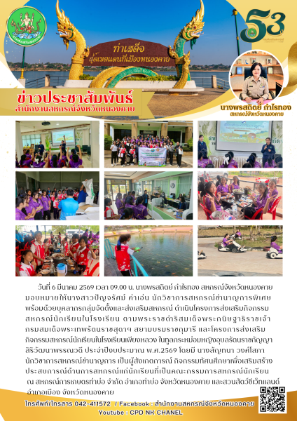 2569 เวลา 09.00 น. นางพรสถิตย์ กำไรทอง สหกรณ์จังหวัดหนองคาย มอบหมายให้นางสาวปัญจรัศม์ ค่าเอ่น นักวิชาการสหกรณ์ชำนาญการพิเศษ พร้อมด้วยบุคลากรกลุ่มจัดตั้งและส่งเสริมสหกรณ์ ดำเนินโครงการส่งเสริมกิจกรรมสหกรณ์นักเรียนในโรงเรียน ตามพระราชดำริสมเด็จพระกนิษฐาธิราชเจ้า